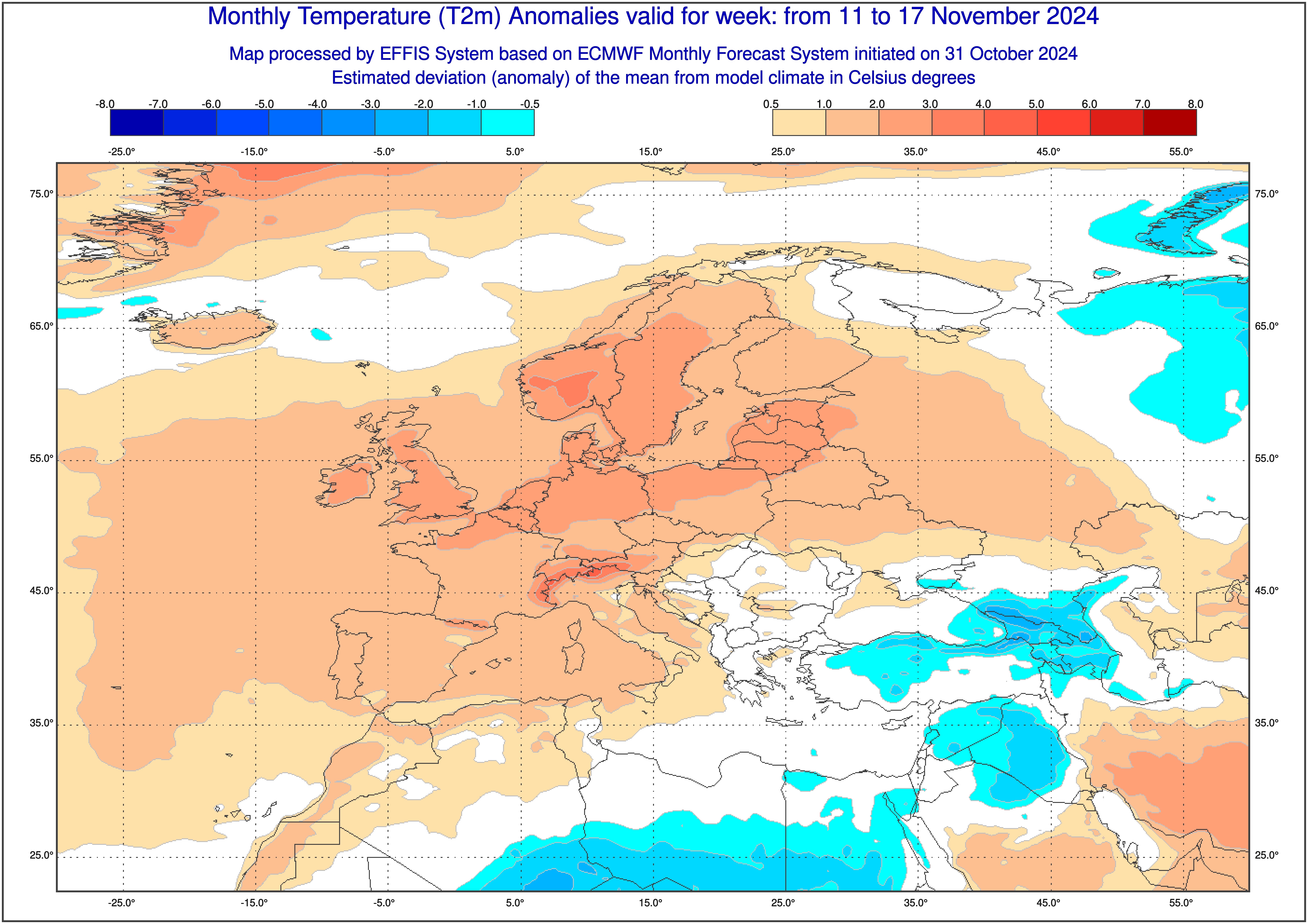 Τέλος, κατά τη διάρκεια του τρίτου διαστήματος, η αβεβαιότητα γίνεται ιδιαίτερα μεγάλη, οπότε θα δούμε μια πιο γενική εικόνα για τον καιρό στη χώρα μας με τη βοήθεια του EFFIS System, που βασίζεται σε στοιχεία από το Ευρωπαϊκό προγνωστικό μοντέλο ECMWF.