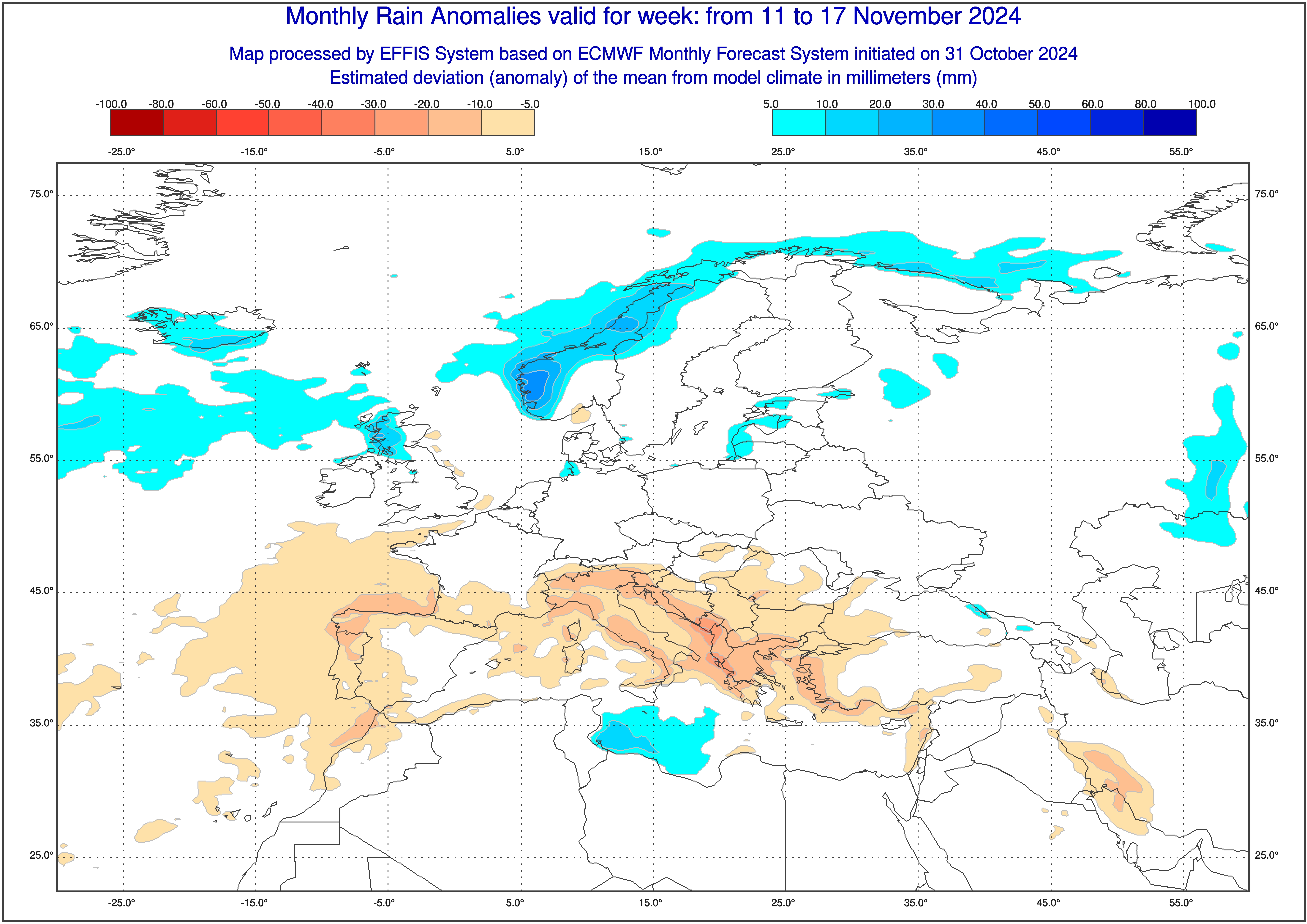 Από την άλλη, στον παρακάτω χάρτη που παρουσιάζει τις υετικές αποκλίσεις του μήνα, τα πράγματα εξακολουθούν να είναι απαισιόδοξα, με τις αποκλίσεις πάνω από τη χώρα μας να είναι αρνητικές ακόμα και κατά 20 με 30 mm.