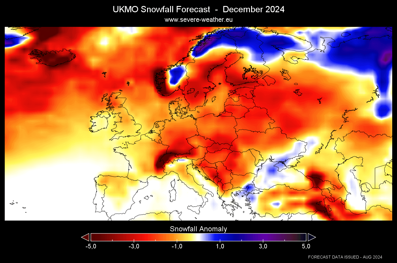 Οι προβλέψεις για χιονοπτώσεις του Δεκεμβρίου δείχνουν λιγότερες χιονοπτώσεις από το κανονικό σε μεγάλο μέρος της ηπείρου. Μια περιοχή με περισσότερες χιονοπτώσεις είναι στις Άλπεις και ξανά στην βόρεια Σκανδιναβία.