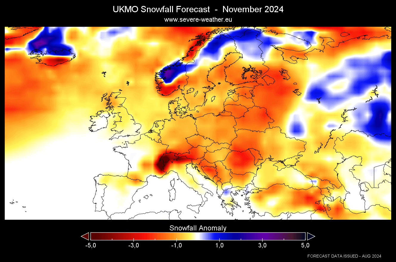 Οι προβλέψεις του Νοεμβρίου δείχνουν επίσης χιονοπτώσεις κυρίως κάτω του μέσου όρου σε όλη την Ευρώπη.Πιθανές εντονότερες χιονοπτώσεις αναμένονται στις Άλπεις και στα βόρεια Βαλκάνια.