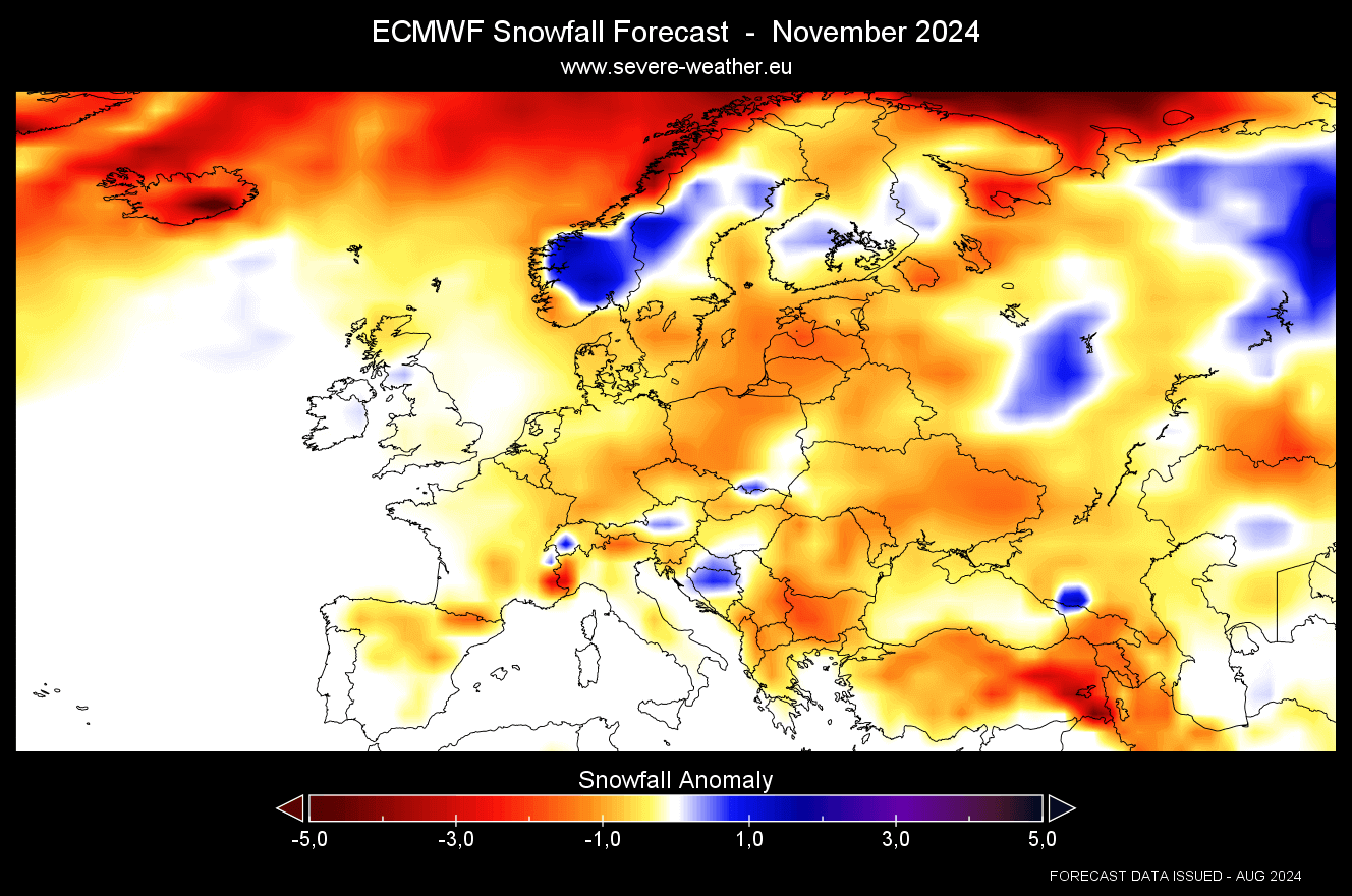 Οι προβλέψεις του Νοεμβρίου δείχνουν επίσης χιονόπτωση κυρίως κάτω του μέσου όρου σε όλη την Ευρώπη. Πιθανή εντονότερη χιονόπτωση αναμένεται στις Άλπεις και στα βόρεια Βαλκάνια.