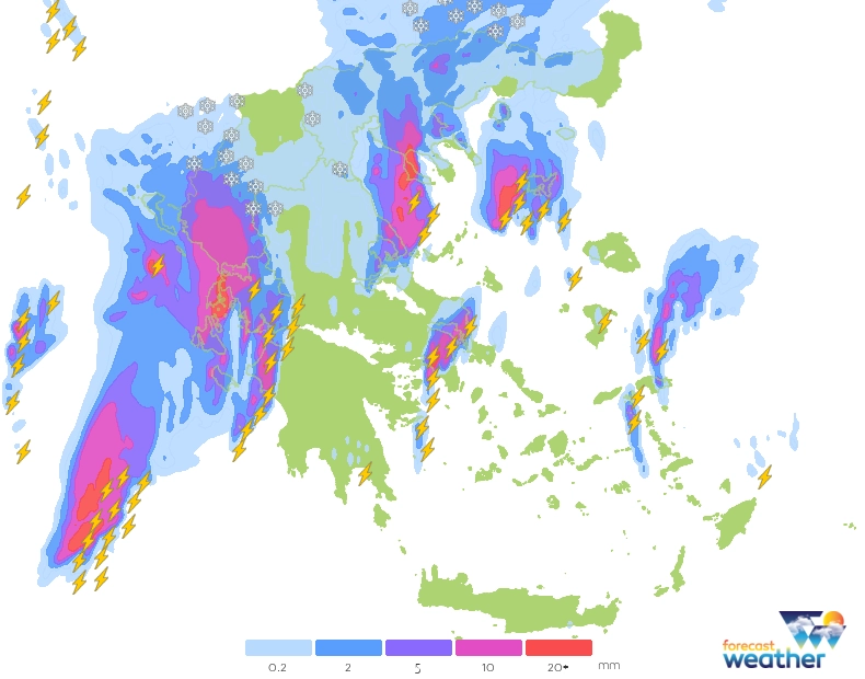 Πελοπόννησος: Κατά τόπους και κατά περιόδους βροχοπτώσεις και παροδικές καταιγίδες, κυρίως στα δυτικά και νότια τμήματα (στα νότια κατά βάση τις νυχτερινές ώρες). Τοπικές καταιγίδες θα απασχολήσουν και την Αργολίδα. Χιονοπτώσεις άνω των 1700μ. στα κεντρονότια, άνω των 1500-1600μ. στα βόρεια.