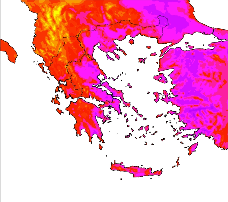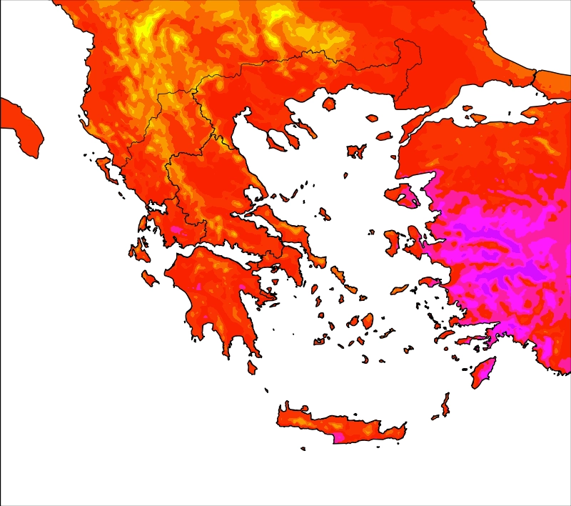 Η θερμοκρασία στα Βόρεια ηπειρωτικά τμήματα θα φτάσει τους 34-36 και στα ΒΑ ακόμη και τους 38, στα Δυτικά και Νότια έως τους 33-35, ενώ στα Κεντρικά και Ανατολικά θα αγγίξει τους 37-39 και τοπικά 40-41 βαθμούς(κυρίως Θεσσαλικό κάμπο). Στα νησιά του Αιγαίου και του Ιονίου, ο υδράργυρος δε θα ξεπεράσει τους 30-32, με εξαίρεση την Κρήτη και τη Ρόδο που εκεί θα φτάσει τοπικά τους 34-35°C.