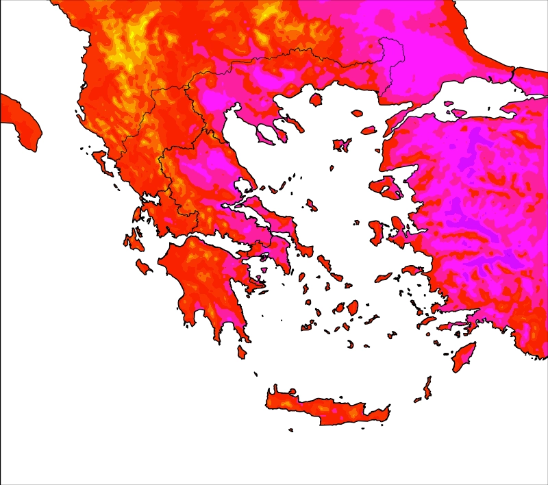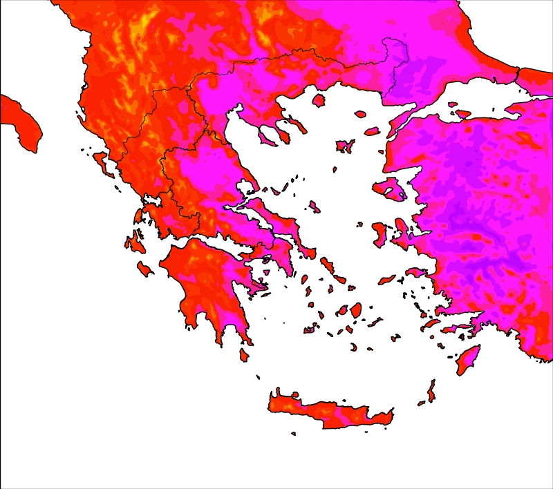 Η θερμοκρασία χωρίς αξιόλογη μεταβολή, στα Δυτικά και Νότια ηπειρωτικά δε θα ξεπεράσει τους 30-32 βαθμούς, ενώ στα υπόλοιπα τμήματα θα ανέβει στους 34-36°C και τοπικά στη Θράκη, τη Θεσσαλία, την Αν. Στερεά(Ν. Βοιωτίας) και Αν. Πελοπόννησο(Ν. Αργολίδας) θα αγγιξει τους 37-38 βαθμούς με την ελάχιστη τις νυχτερινές και πρώτες πρωινές ώρες να μην πέφτει κάτω από τους 23-25°C στις θαλάσσιες και παραθαλάσσιες περιοχές. Στις ορεινές περιοχές θα είναι σαφώς χαμηλότερη. Στα νησιά του Ιονίου ο υδράργυρος δε θα ξεπεράσει τους 27-29 και τοπικά 30°C, ενώ στου Αιγαίου θα ανέβει στους 30-32 και τοπικά στα νησιά του Ανατολικού πελάγους, την Κρήτη και τα Δωδεκάνησα στους 33-35 βαθμούς.