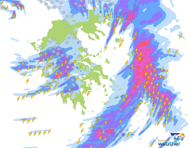 Τα φαινόμενα θα έχουν περάσει πλέον ανατολικότερα όπου θα εκδηλώνονται βροχές και σποραδικές καταιγίδες στις πεδινές και παραθαλάσσιες περιοχές της Αν. Μακεδονίας, της Θράκης, της Αν. Ηπείρου, της Θεσσαλίας, της Εύβοιας, της Στερεάς Ελλάδας και της Βόρειας Πελοποννήσου καθώς και στα νησιωτικά τμήματα του Αιγαίου με έμφαση στις Σποράδες και τα Δωδεκάνησα, ενώ πυκνές χιονοπτώσεις θα σημειωθούν σε ορεινές και ημιορεινές περιοχές των περιοχών αυτών περίπου πάνω από τα 700-800 μέτρα και πρόσκαιρα τις πρωινές και νυχτερινές ώρες σε χαμηλότερο υψόμετρο. Δεν αποκλείται επίσης να πέσουν πρόσκαιρα λίγα χιόνια και σε Φλώρινα, Καστοριά, Κοζάνη και Πτολεμαΐδα, ενώ στις υπόλοιπες περιοχές θα υπάρχουν νεφώσεις με πιθανότητα τοπικών ασθενών βροχών μικρής διάρκειας.