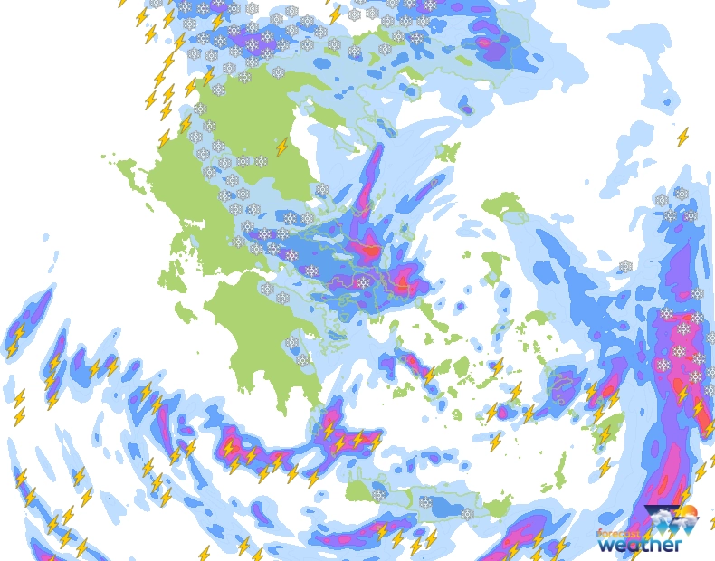 Βροχές και κατά τόπους έντονες καταιγίδες θα σημειώνονται το πρωί στα νησιά του Ανατολικού Αιγαίου, τις Κυκλάδες, τα Δωδεκάνησα και την Κρήτη με εξασθένηση από το απόγευμα, ενώ τοπικά διάσπαρτες βροχές ασθενείς έως μέτριας έντασης θα εκδηλώνονται στα νησιά του Ιονίου, την Ήπειρο, την Δυτική Στερεά, την Πελοπόννησο, τη Μακεδονία, τη Θράκη, τις Σποράδες και την Εύβοια, χωρίς να αποκλείεται και η πιθανότητα μεμονωμένων καταιγίδων στις Κυκλάδες τις απογευματινές ώρες. Παροδικά ασθενείς χιονοπτώσεις θα σημειώνονται κατά διαστήματα στα ορεινά της Δυτικής και Βόρειας Μακεδονίας περίπου από τα 400-600 μέτρα, στην Ήπειρο και τη Δυτική και Κεντρική Στερεά πάνω από τα 700-900 μέτρα(πρόσκαιρα ίσως και χαμηλότερα), στη Θεσσαλία περίπου πάνω από τα 900-1000 και στην Πελοπόννησο πάνω από τα 1000-1200 μέτρα, ενώ χιόνια θα πέσουν και στα ορεινά της Κρήτης περίπου πάνω από τα 1700 μέτρα. Στις υπόλοιπες περιοχές θα υπάρχουν νεφώσεις με μεγαλύτερα διαστήματα ηλιοφάνειας από το μεσημέρι.