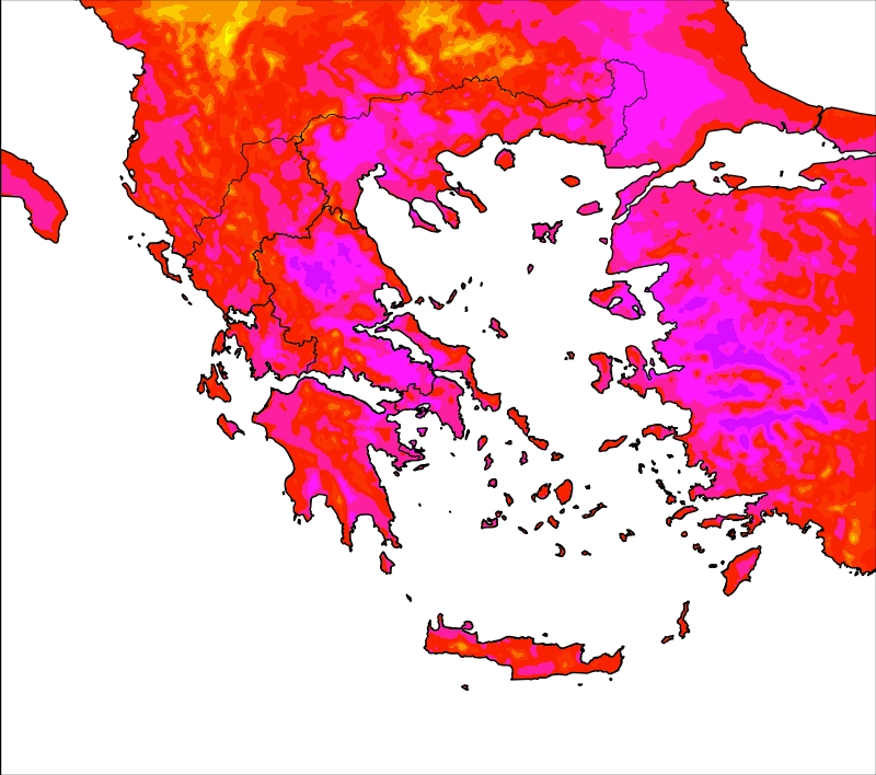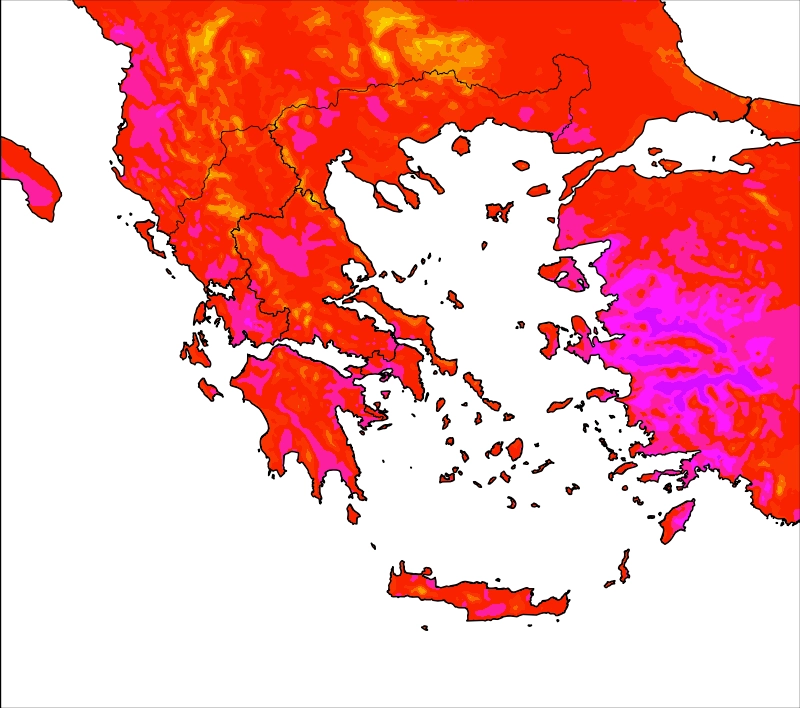 Η θερμοκρασία σε περαιτέρω άνοδο, στα ηπειρωτικά θα φτάσει τους 33-35 και τοπικά στα ΒΑ(Θράκη) τους 36°C, ενώ στα Κεντρικά και Ανατολικά ηπειρωτικά το θερμόμετρο θα δείξει 37-39 βαθμούς(κυρίως Θεσσαλικό κάμπο). Στα νησιωτικά τμήματα των πελάγων μας λόγω της θαλάσσιας αύρας δε θα ξεπεράσει τους 29-31 και τοπικά τους 33 βαθμούς στα νησιά του Ανατολικού Αιγαίου και την Κρήτη.