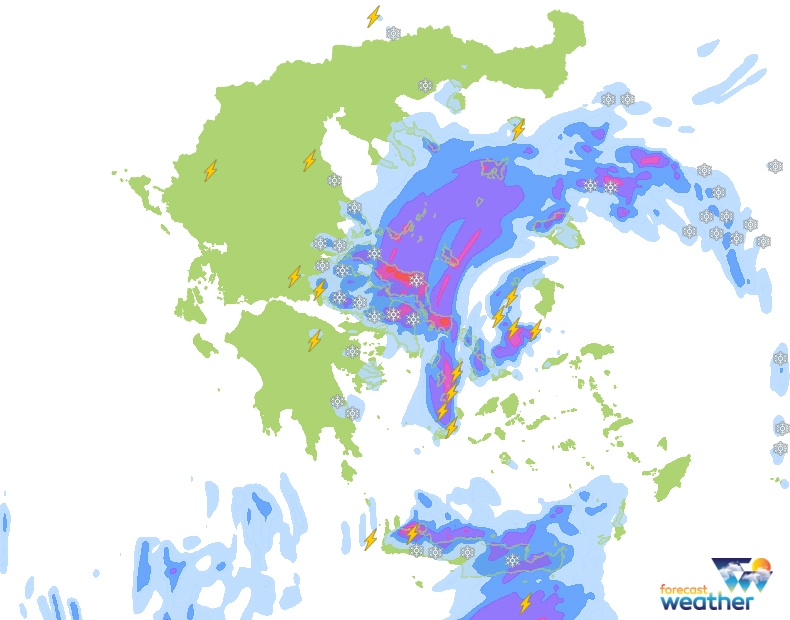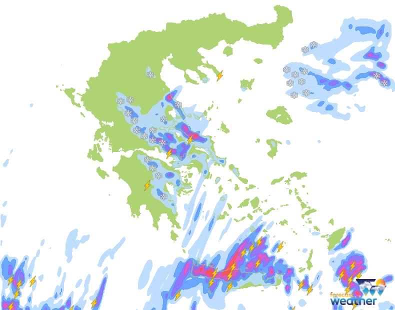 Τα φαινόμενα, από την προηγούμενη νύχτα προς τα ξημερώματα, θα ενταθούν και θα εκδηλωθούν ισχυρές βροχές και σποραδικές καταιγίδες στα πεδινά και παραθαλάσσια των Ανατολικών προσήνεμων και τα νησιωτικά τμήματα του Αιγαίου όπως τις Σποράδες, τις Κυκλάδες και την Κρήτη και πιο τοπικά στα Ανατολικά τμήματα και τα Δωδεκάνησα, ενώ πυκνές χιονοπτώσεις θα εκδηλώνονται από τις πρωινές ώρες στα ορεινά-ημιορεινά της ΝΑ Ηπείρου, της Νότιας Θεσσαλίας, της Εύβοιας, της Κεντρικής και Ανατολικής Στερεάς και της Βόρειας και Ανατολικής Πελοποννήσου περίπου πάνω από τα 700-800 μέτρα και της Κρήτης περίπου πάνω τα 900-1100. Μικρή εξασθένηση θα παρουσιάσουν τα φαινόμενα από το απόγευμα στα Ανατολικά ηπειρωτικά, ενώ στα υπόλοιπα τμήματα θα υπάρχουν αρχικά νεφώσεις με τοπικές βροχές στη Νότια Πελοπόννησο όπου γρήγορα θα διαλυθούν και θα επικρατήσει ηλιοφάνεια.