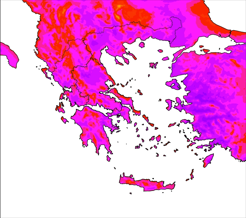 Η θερμοκρασία στη Θεσσαλία, τη Κεντρική Μακεδονία, τη Θράκη όπως επίσης στο Νομό Άρτας, Πρέβεζας, Αιτωλοακαρνανίας, Αττικής, Ηλείας, Λακωνίας και Αργολίδας θα αγγιξει τους 38-40 και τοπικά τους 41°C. Στα υπόλοιπα ηπειρωτικά θα φτάσει τους 37-38, ενώ η ελάχιστη τις νυχτερινές και πρώτες πρωινές ώρες δεν φαίνεται να πέφτει κάτω από τους 23-25 και στα Ανατολικά ηπειρωτικά κάτω από τους 26-28 βαθμούς. Στις ορεινές περιοχές θα είναι σαφώς λίγο χαμηλότερη. Στα νησιωτικά τμήματα των πελάγων μας η μέγιστη θα φτάσει τους 33-35°C και τοπικά στα νησιά του Ανατολικού Αιγαίου, τα Δωδεκάνησα και την Κρήτη τους 37-39 βαθμούς. Υψηλός αναμένεται να είναι και ο δείκτης δυσφορίας στις θαλάσσιες και παραθαλάσσιες περιοχές λόγω του συνδυασμού των μεγάλων ποσοστών υγρασίας σε συνδυασμό με τις υψηλές θερμοκρασίες.