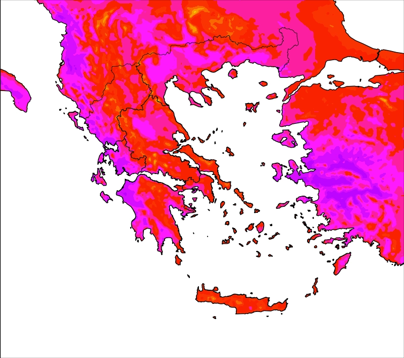 Η θερμοκρασία χωρίς αξιόλογη μεταβολή στα Δυτικά θα φτάσει τους 37-39 και τοπικά ίσως και 40°C, ενώ στα υπόλοιπα ηπειρωτικά θα ανέβει στους 34-36 και τοπικά στα ΒΑ στους 37 βαθμούς. Στα νησιά του Ιονίου θα φτάσει τους 33-35°C, ενώ στου Αιγαίου, λόγω του ισχυρού μελτεμιού δε θα ξεπεράσει τους 29-31, με εξαίρεση τα νησιά του Αν. πελάγους, τα Δωδεκάνησα και τη Νότια Κρήτη που τοπικά θα φτάσει τους 35-37 βαθμούς.