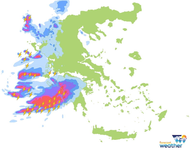 Από τα ξημερώματα και νωρίς το πρωί λοιπόν θα σημειώνονται ισχυρές βροχές και καταιγίδες στα νησιά του Ιονίου καθώς στο Νόμο Πρέβεζας, Άρτας, Αιτωλοακαρνανίας, Αχαϊας, Ηλείας, Μεσσηνίας και Αρκαδίας. Τα φαινόμενα θα είναι κατά τόπους έντονα, αφού θα συνοδευόνται από αυξημένη ηλεκτρική δραστηριότητα, ενώ μεγάλος είναι ο κίνδυνος πλυμμηρικών επεισοδίων. Πιο ήπιας έντασης βροχές θα εκδηλωθούν στην υπόλοιπη Πελοπόννησο, την Κεντρική Στερεά(συμπεριλαμβανομένης και της Αττικής), την Εύβοια, την Ανατολική Ήπειρο, τη Θεσσαλία και τη Δυτική και Κεντρική Μακεδονία. Στην υπόλοιπη χώρα θα υπάρχει ηλιοφάνεια με λίγες νεφώσεις που από το απόγευμα στο Αιγαίο θα πυκνώσουν και δεν αποκελείεται να σημειωθούν τοπικές βροχές επίσης στις Σποράδες και τις Κυκλάδες.
